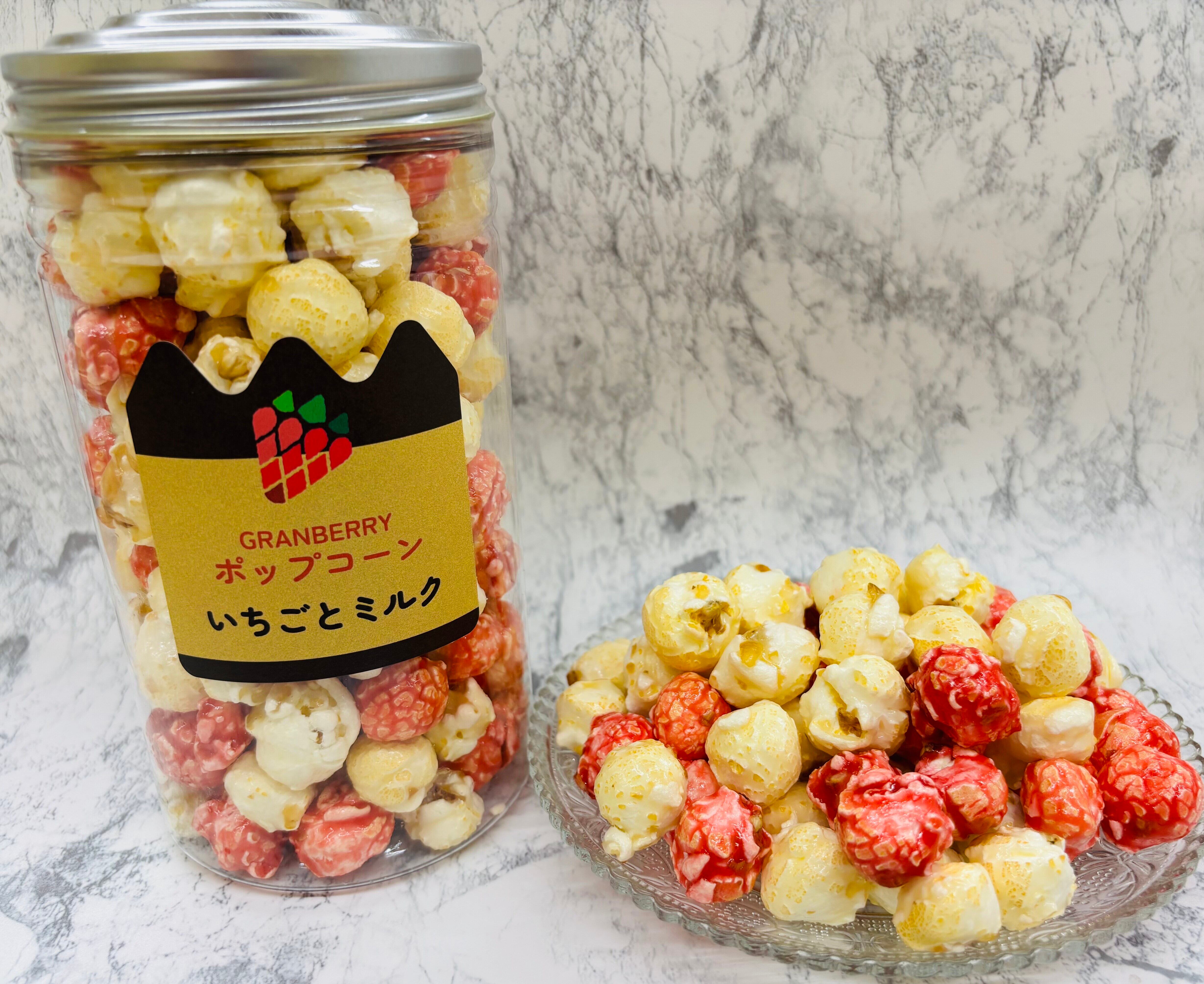 見た目もカラフルでかわいいキャラメルコーティングのポップコーンです♪新鮮で甘酸っぱい自社農場のイチゴとリッチミルクの2種類が入っています。