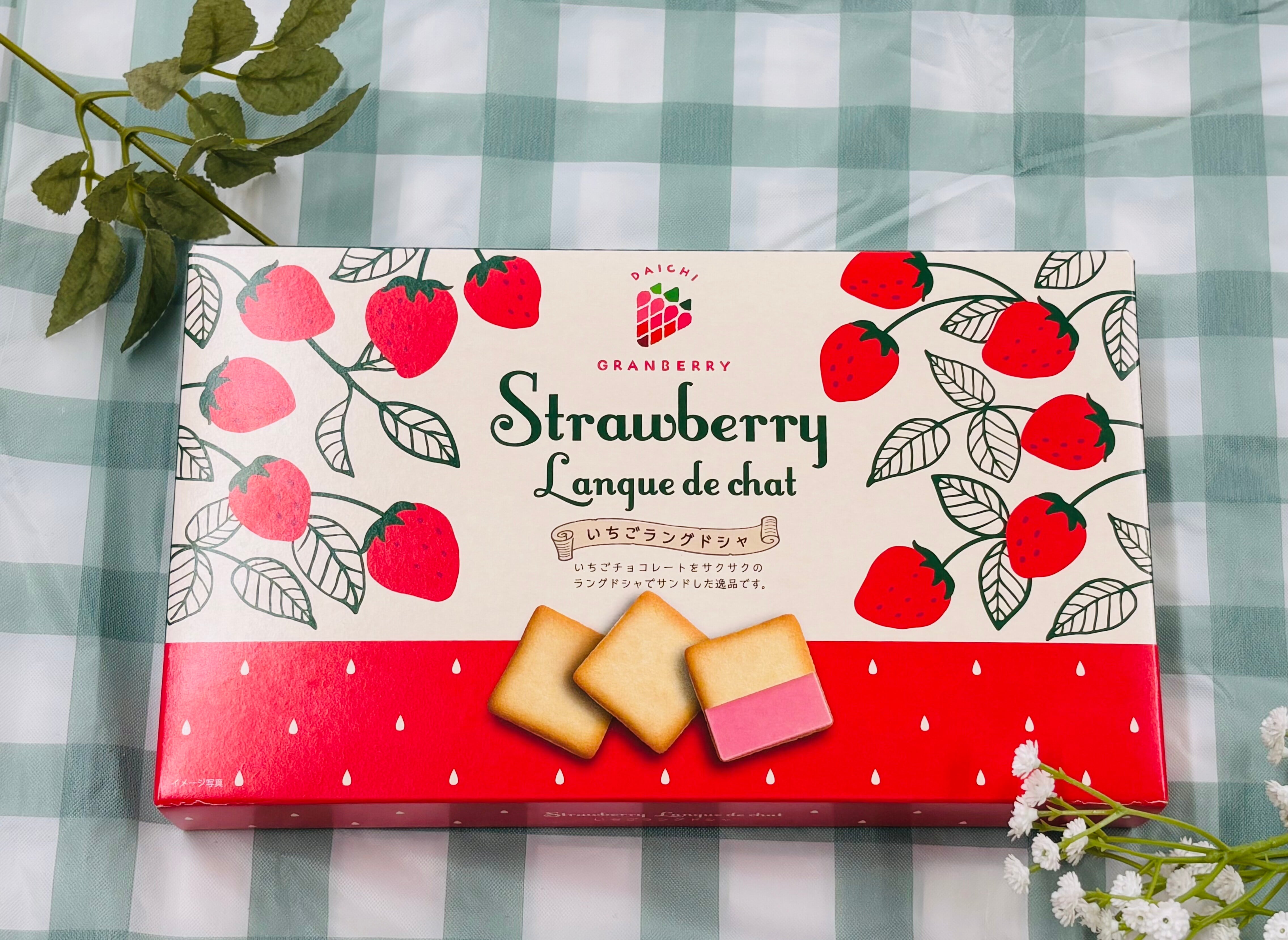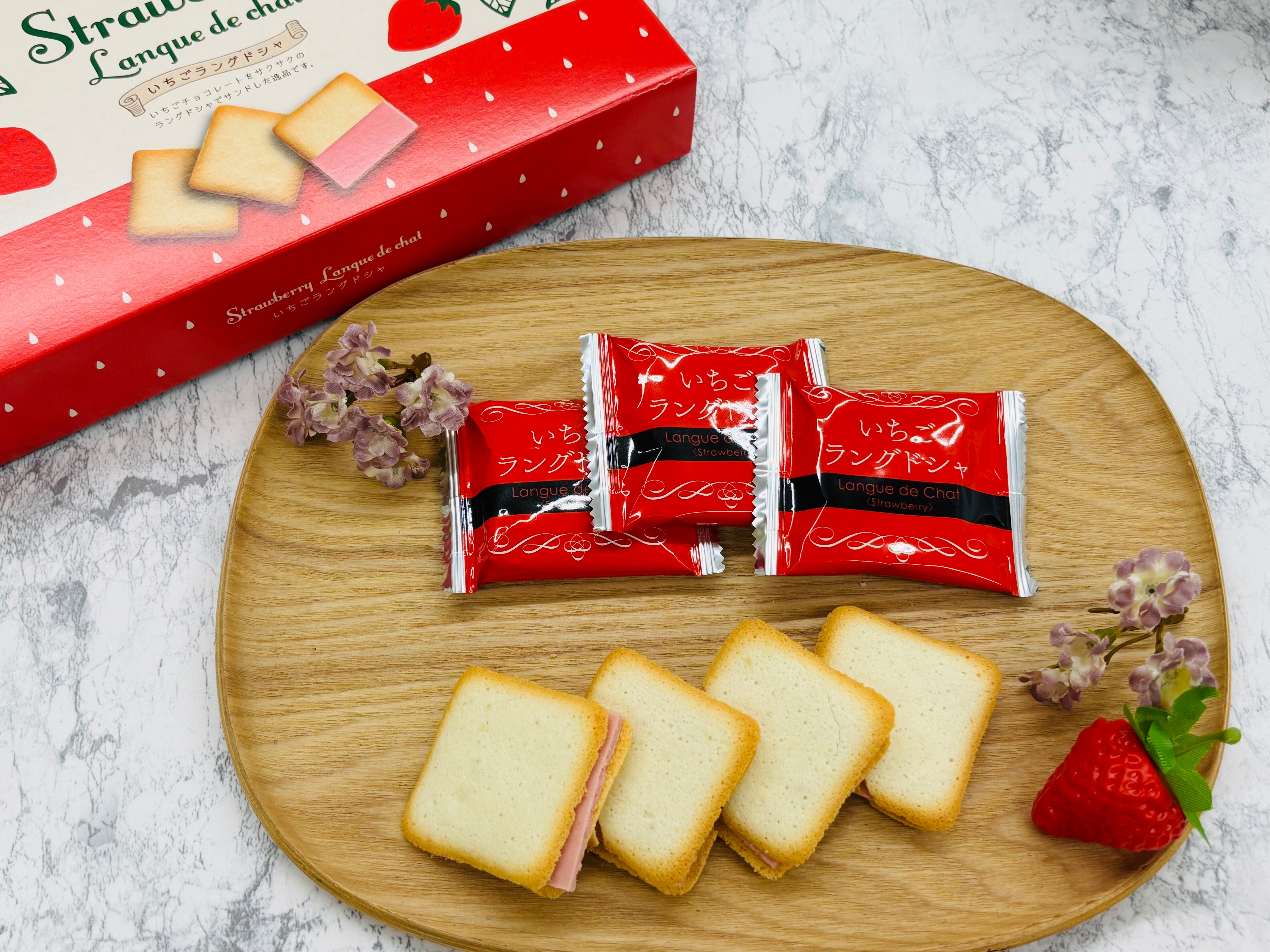 サクサクとしたラングドシャクッキーで、いちごのチョコレートをサンドしました。おやつタイムにぴったりな一品です!